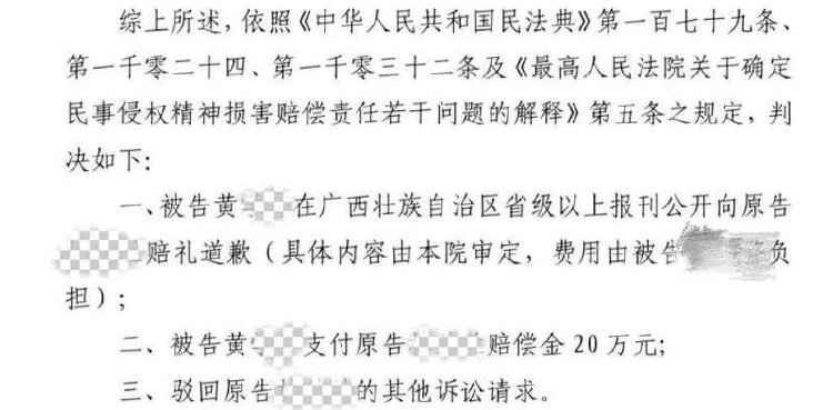 法院判决黄某在广西壮族自治区省级以上报刊公开赔礼道歉,并赔偿刘晓玲20万元。受访者供图