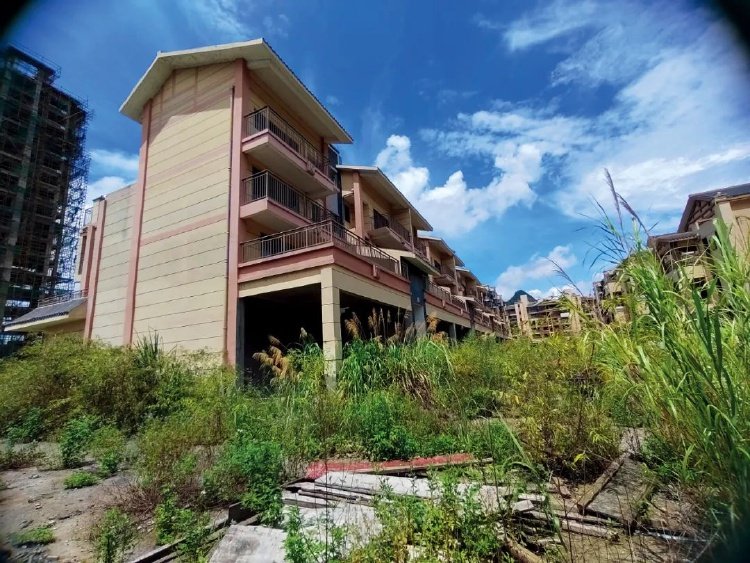 中国新闻周刊消息,多座停工的建筑周边杂草丛生,地面上铺满瓦砾、石块等。这些烂尾建筑上的脚手架早已锈迹斑斑,楼体周围的绿色防尘网破损严重。一栋17层的住宅项目已经封顶,尚未砌墙,也处于停工状态。附近还写有“康养住宅,尽享健康安逸”“欢迎参观样板间”等宣传语。