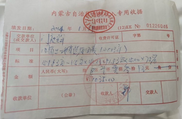 2014年,老门缴纳国有土地有偿使用费的票据,收款单位为托扎敏乡乡政府。 新京报记者 赵敏 摄