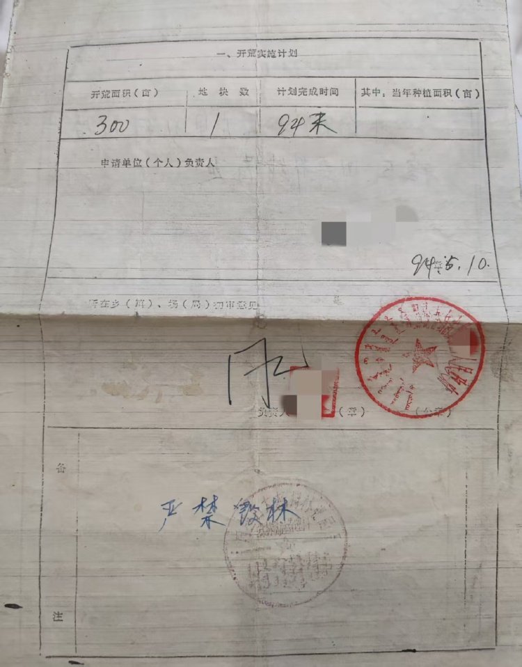 1994年,代玉(化名)拿到的开荒审批表,上面备注“严禁毁林”。 受访者供图