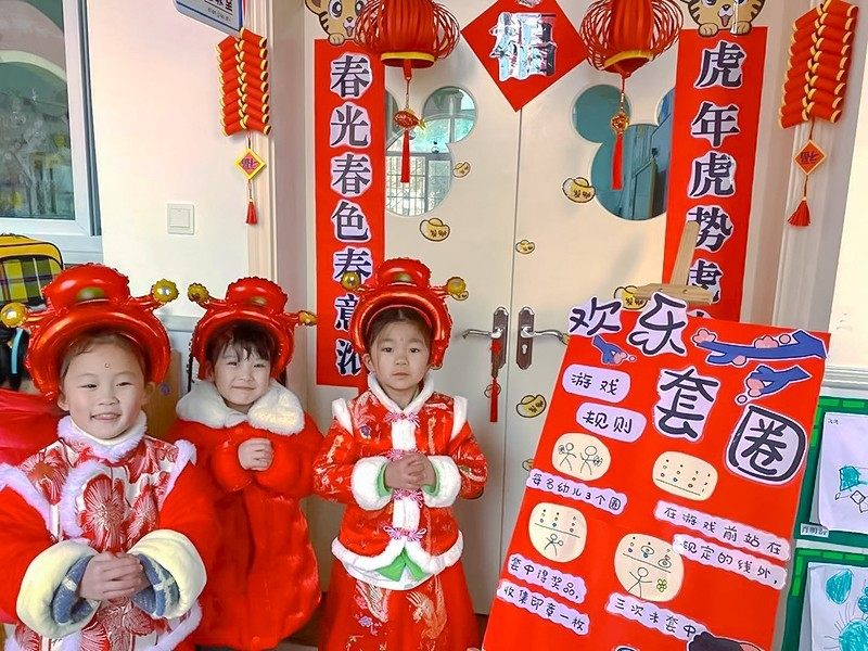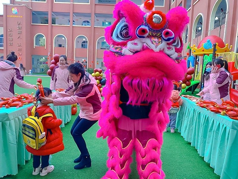 活动包括发新年红包、快乐新年、我爱运动、逛庙会等内容。首先,狮子在门口接待,老师和孩子们进行了拜年活动,老师在门口给入园幼儿发新年红包,并戴上老虎头饰,点上朱砂痣,寓意开启未来之门,成就梦想之路,并分享着节日的快乐。