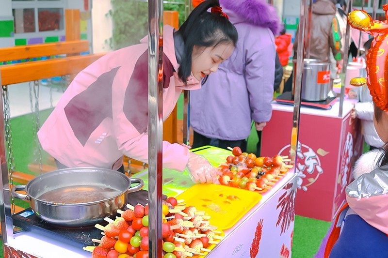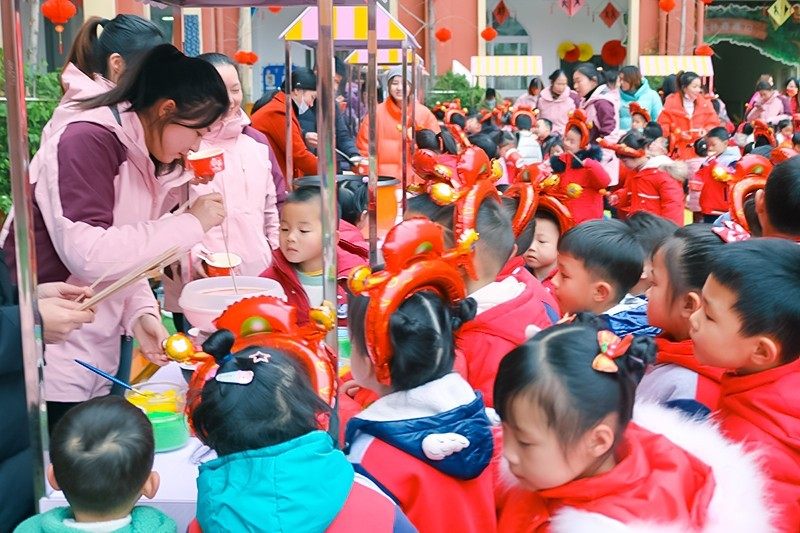 最后,进行了逛庙会活动,幼儿逛传统小吃街,小吃街里摆放传统特色小吃供孩子吃,如爆米花、冰糖葫芦、棉花糖等孩子们自由在美食一条街中穿梭,品年味。