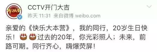 “以快乐之名,与你相遇,我的青春有你,你的快乐有我,20岁,谢谢亲爱的你,陪我从过去到现在和未来。前路可期,一直在一起!”昨天,湖南卫视《快乐大本营》迎来了20周岁生日,一条生日微博获得了包括赵薇、范冰冰、黄磊、杨幂、李易峰、TFBOYS、刘昊然等在内的等超百位艺人大咖转发和点赞。不仅如此,《开门大吉》《中华情》《开讲啦》以及深圳卫视等同行也纷纷送上祝福,向这个20岁的“寿星”表白。