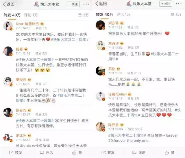 截至目前,该条微博以162万的转发量成为了当之无愧的“人气王”,与此同时,#快乐大本营二十周年#的微博话题阅读量高达11.6亿,讨论量291.2万,节目影响力由此可见一斑。不管是已经参加过了好几次节目的艺人嘉宾,还是目前为止尚未接触过《快乐大本营》的艺人嘉宾,都纷纷赶来“出席”《快乐大本营》的“微博生日party”,这不得不让人感叹《快乐大本营》的“人缘”之广。一个生日便聚集了几乎大半个娱乐圈的祝福和点赞,《快乐大本营》为何能如此受欢迎?