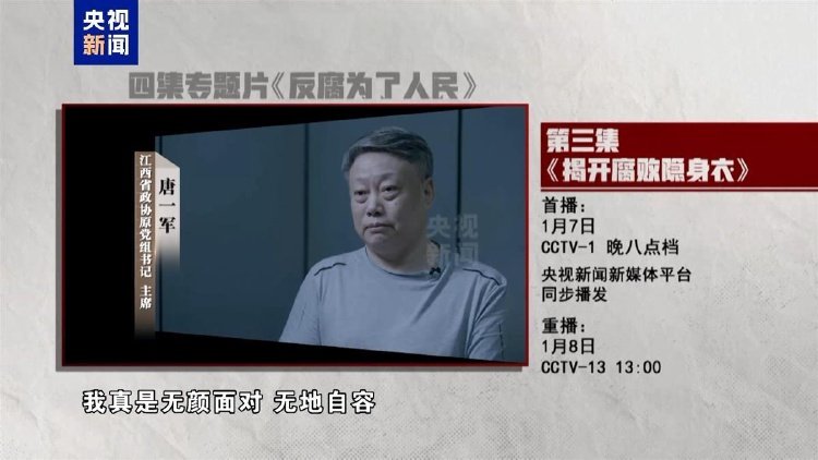 央视播出的预告片显示,江西省政协原党组书记、主席唐一军,贵州省委原书记孙志刚,广东省高州市人民医院原党委书记、院长王茂生等人将出镜忏悔。