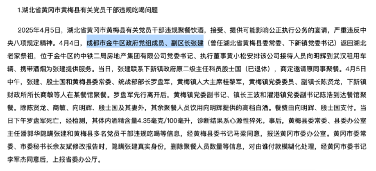 通报提到,问题发生后,湖北省、四川省纪委监委和中国中铁纪委提级办理,给予相关责任人处理处分。其中,给予张建开除党籍、政务撤职处分,降为二级科员。