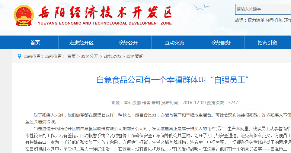 白象一共雇佣了多少残疾员工,这一数字没有公开报道。但2016年岳阳经济技术开发区官网上有这样一段介绍:在白象湖南分公司成立之初,就吸纳了大量的残疾人就业。到目前为止,湖南分公司共有485名员工,安排残疾员工117人就业,残疾职工人均年收入30843.06元,残疾职工年均福利15249元。对于残疾员工,公司统一称呼为“自强员工”。
