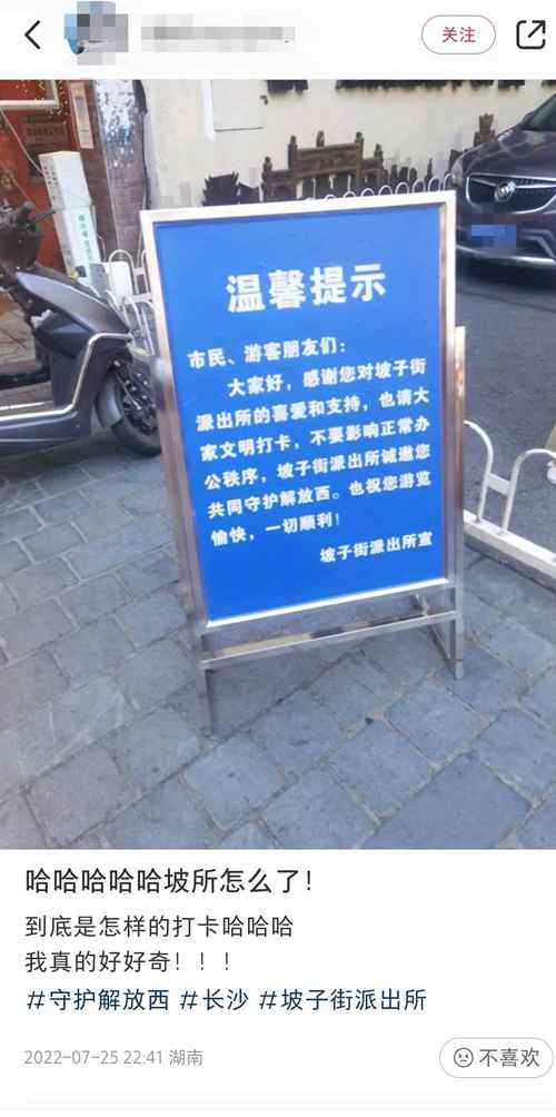 近日,有网友发帖称,在路过因为纪录片《守护解放西》爆火的长沙市公安局天心分局坡子街派出所时,发现门口已经立了告示,请大家文明打卡,不要影响正常办公秩序。有网友表示,这块牌子之前都没看到,应该是新立的,可能是打卡的人太多了。上游新闻(报料邮箱baoliaosy@163.com)记者搜索7月初在派出所门口打卡的游客照,还没看到这块告示牌。