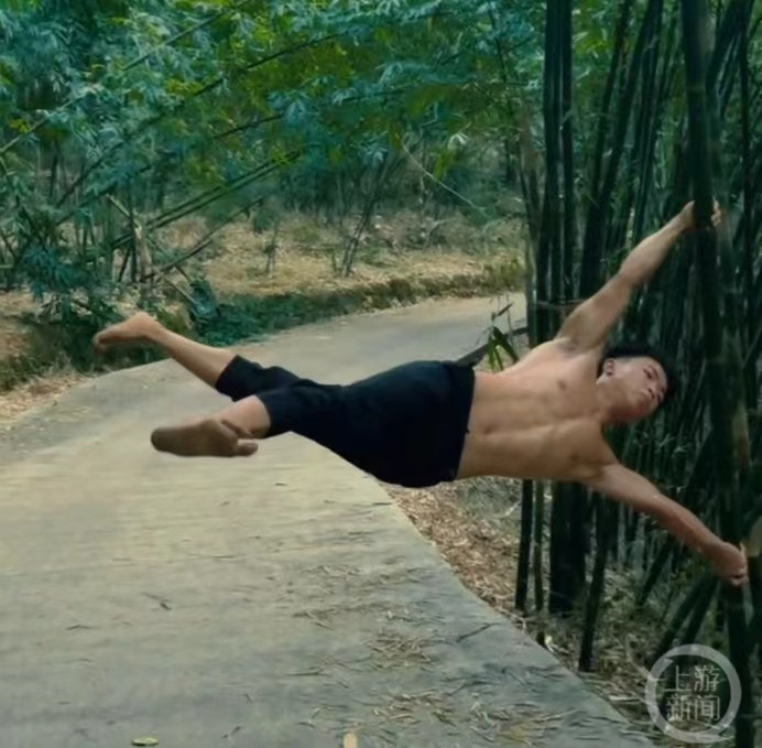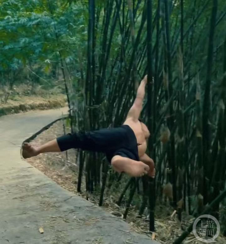 在短视频平台,他在竹林里展示的多个高难度动作都引发了网友的关注和热议。比如,一段视频里,他手脚并用,爬上竹竿的高处,仅花了5秒的时间,之后,又灵活爬下,接着,再次上下,如此循环往复4次,大气也不喘一下。对此,网友评价:“比峨眉山的猴子还灵活!”