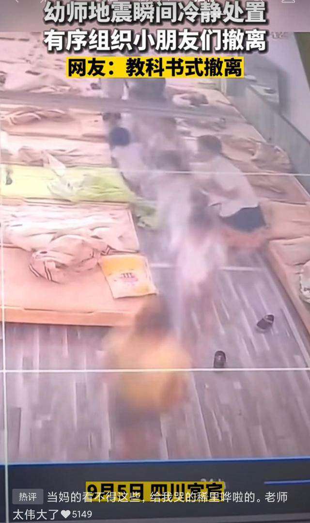 地震发生的时候,两名老师正在照看一班幼儿午睡。感受到地震震动后,老师急忙叫醒了入睡的孩子们,组织他们有序从房间里撤离。只见孩子们在老师的指挥下,翻身下床一个紧跟一个,小跑着出了房间。视频中两名女教师既紧张又镇定,有条不紊组织孩子们撤离,遇到需要帮助的孩子她们飞身上前,遇到还没起床的孩子,她们抱起孩子就跑。