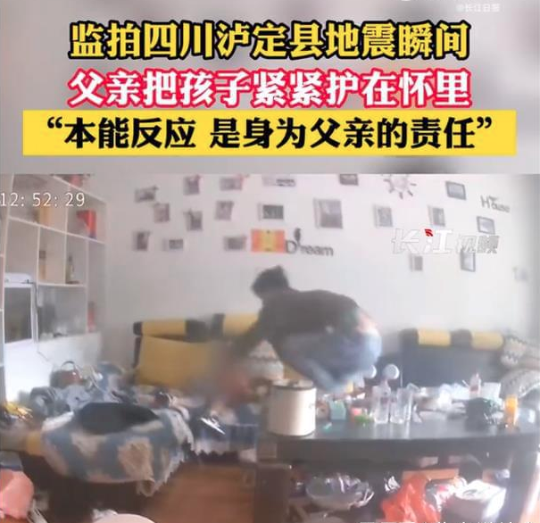 泸定县一居民家中的监控视频显示,在地震没有发生之前,一位爸爸和一位孩子正躺在沙发上休息。地震发生之后,周围所有的桌椅柜子都在剧烈摇晃,爸爸立马起身,用自己整个身躯把孩子护在下面。尽管他没有展示出避险或逃跑的其他经验或技能,但就是这危险来临时本能的一护,已经感动了万千网友。