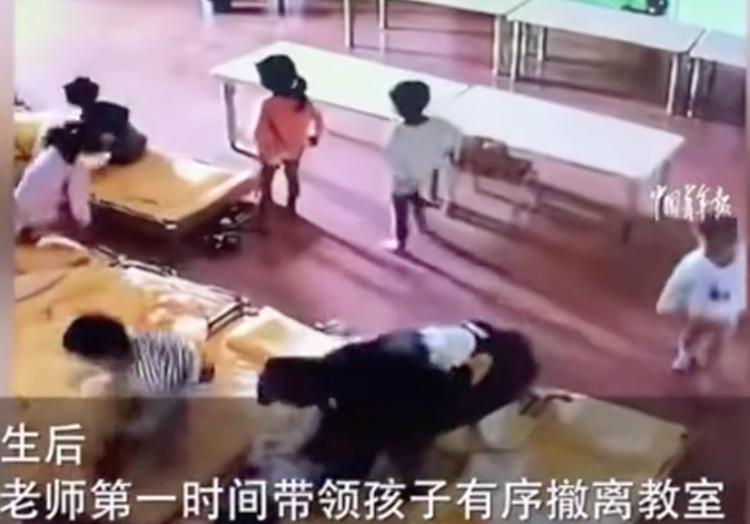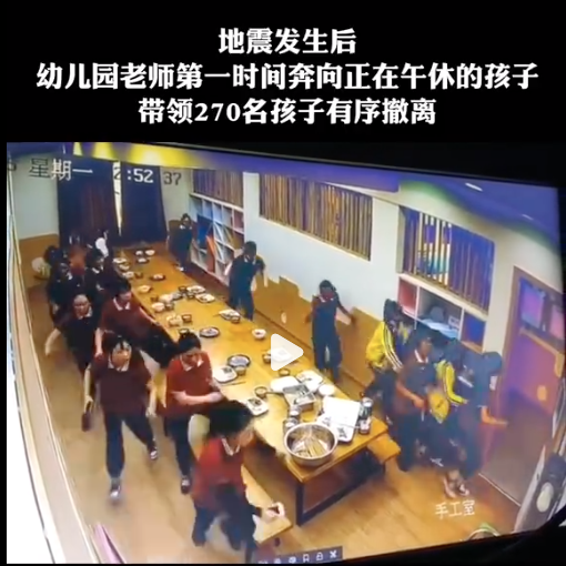 四川另一家幼儿园的监控画面显示,地震发生时孩子们正在午休,老师们正在吃饭。感知到地震的瞬间,老师们没有任何多余的交流和迟疑,十几个人同时扔下碗筷狂奔向正在午休的孩子,带领270名孩子有序撤离至空旷地。