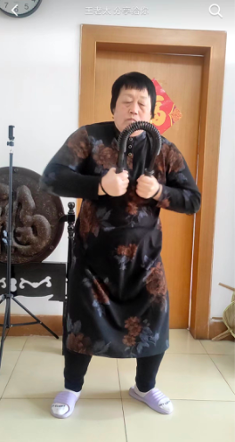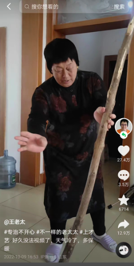 然而,王老太最为大家熟悉的并不是掰臂力棒,在她发布的视频中,有一个系列叫做“手上飞棍”,视频中,她将一根杯口粗的木棍放在手边,然后左后晃动,木棍能随着手臂左右“飞摇”却不落地,场景比较魔幻。她表演“飞棍”的视频单条点赞量就超过了27万。