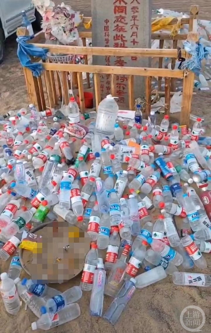 为何彭加木纪念碑附近会出现大量的瓶装矿泉水?丁丁回答道:“这个水不仅仅是纪念,也是为了应急补给之用。”据丁丁介绍,这是车友自发为需要帮助的人提供的救助物资。