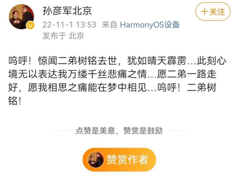 刘备扮演者孙彦军发微博悼念:惊闻二弟树铭去世,犹如晴天霹雳……此时心境无以表达我万缕千丝悲痛之情,愿二弟一路走好,愿我相思之痛能在梦中相见……