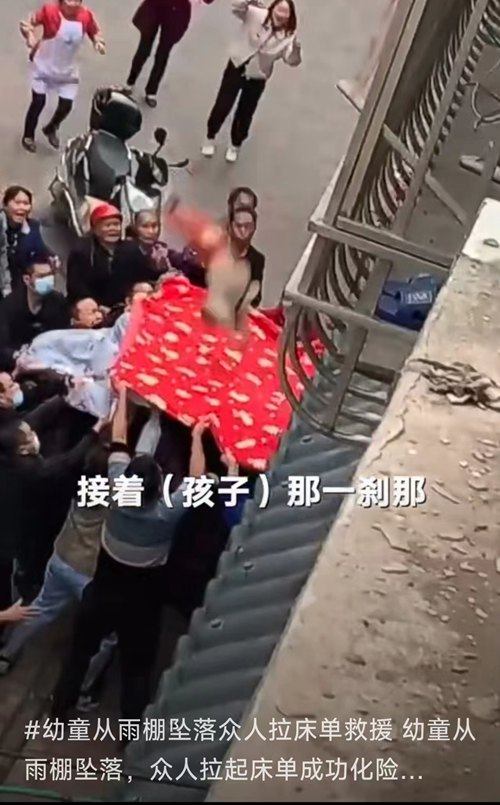 “幸好娃娃还比较听话,蹲到雨棚上,但当时雨棚正下方在施工,不好施救。随后,在大人的指引下,娃娃慢慢移动到方便救援的地方。此时,周围10多名邻居在楼下拉起了床单。”