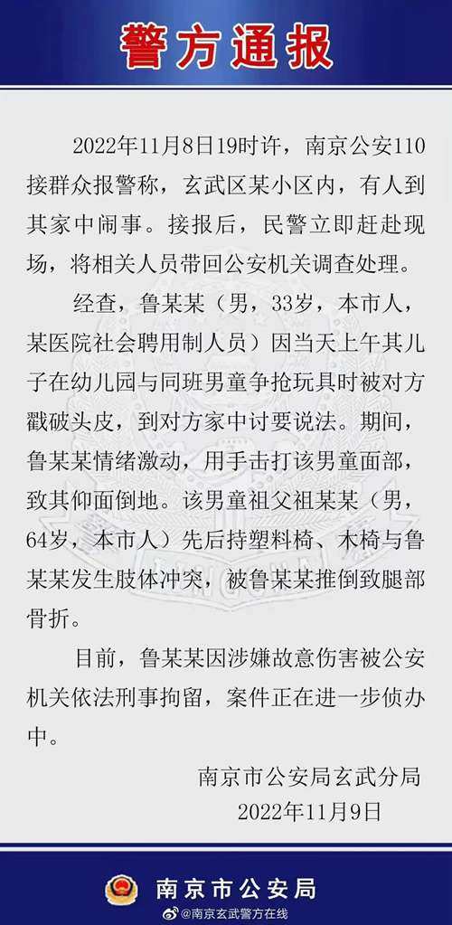 据南京玄武警方消息,2022年11月8日19时许,南京公安110接群众报警称,玄武区某小区内,有人到其家中闹事。接报后,民警立即赶赴现场,将相关人员带回公安机关调查处理。随后南京警方发布通报称,经查,鲁某某(男,33岁,本市人,某医院社会聘用制人员)因当天上午其儿子在幼儿园与同班男童争抢玩具时被对方戳破头皮,到对方家中讨要说法。期间,鲁某某情绪激动,用手击打该男童面部,致其仰面倒地。该男童祖父祖某某(男,64岁,本市人)先后持塑料椅、木椅与鲁某某发生肢体冲突,被鲁某某推倒致腿部骨折。目前,鲁某某因涉嫌故意伤害被公安机关依法刑事拘留,案件正在进一步侦办中。