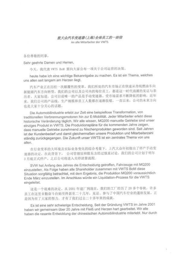 11月17日,针对市场有关“大众汽车变速器(上海)有限公司(下称:大众变速器上海公司)计划于明年3月底正式停产,之后公司将进入关停清算流程”的消息,大众中国回应媒体表示,工厂确将停产,随后进入关停清算流程。