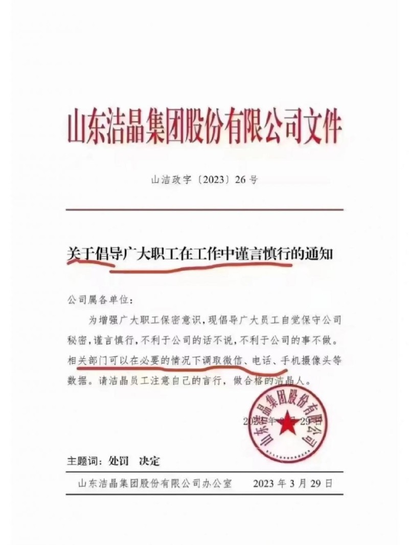 上游新闻记者从这份题为《关于倡导广大职工在工作中谨言慎行的通知》的红头文件上看到,公司要求“为增强广大职工保密意识,现倡导广大员工自觉保守公司秘密,谨言慎行,不利于公司的话不说,不利于公司的事不做。相关部门可以在必要的情况下调取微信、电话、手机摄像头等数据。请洁晶员工注意自己的言行。”