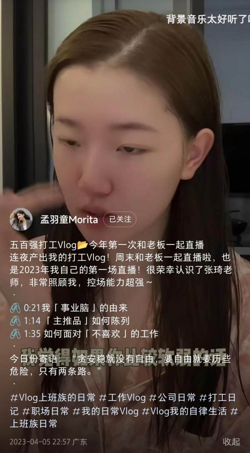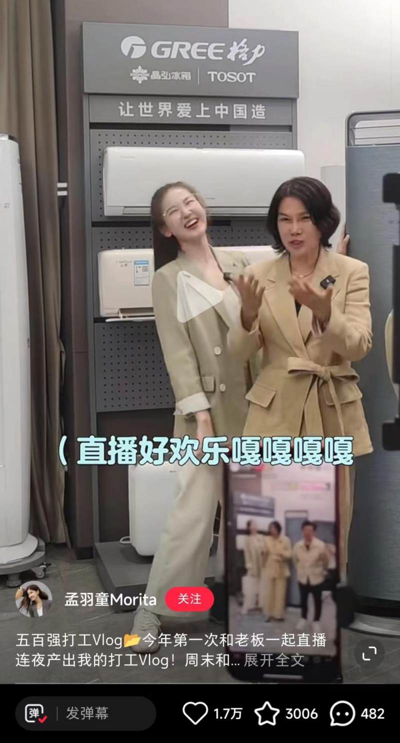 上游新闻注意到,4月5日晚,孟羽童小红书账号“孟羽童Morita”发布了一条动态,文字介绍中写道:“今年第一次和老板一起直播……也是2023年我自己的第一场直播!”而在剪辑的视频开头,正是一段她与格力电器董事长兼总裁董明珠一起直播的画面,画面中孟羽童笑容可掬状态很好地与董事长进行着互动。