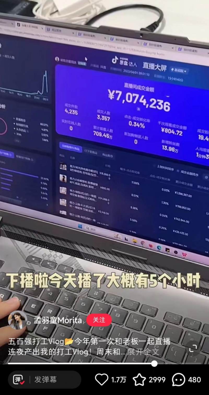 4月7日上午,格力电器董事长兼总裁董明珠称孟羽童不再当她的秘书,并表示相比秘书工作,孟羽童更热爱直播工作。据上游新闻浏览孟羽童社交媒体发现,她4月5日晚于小红书发布的动态显示,她已经进行了“2023年我自己的第一场直播”,视频画面显示,这场直播成交金额超700万元。