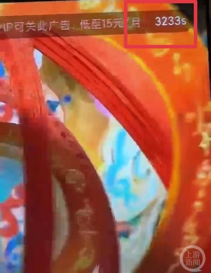 “见过3000多秒的广告吗?我说优酷你别太离谱!”10日,浙江杭州网友“番茄茄”发布视频这样吐槽称。网民发布的视频显示,电视屏幕上正播放着广告,右上方出现3233秒倒计时,旁边有文字提示“VIP可关此广告,低至15元/月”。网友张女士称,自己通过互联网电视看酷喵(优酷正版电视端应用)一部独播剧,该剧不是会员但可免费看前五集,她想先看看,如果好看就再充会员。“前面几集都是等待100多秒的广告,连着看了几集之后,突然就是3000多秒了。没见过这么长的广告,比一集正常的电视剧都要长。不是每一集都这样,应该是个系统漏洞,返回再进就好了。”