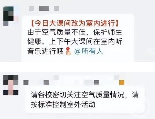 4月12日,杭州多所学校发出通知:取消原来的跑操、大课间等户外活动,改为室内活动。有家长表示,孩子在杭州下沙上小学,本来今天要春游,也临时取消了。有疑似学校发出温馨提醒短信:“受沙尘暴影响,今天上午PM2.5指数已到408(严重),不宜进行运动,对呼吸道有非常严重的伤害,请尽量让学生留在室内,不要去户外,PM2.5口罩的尽量戴上哦”。