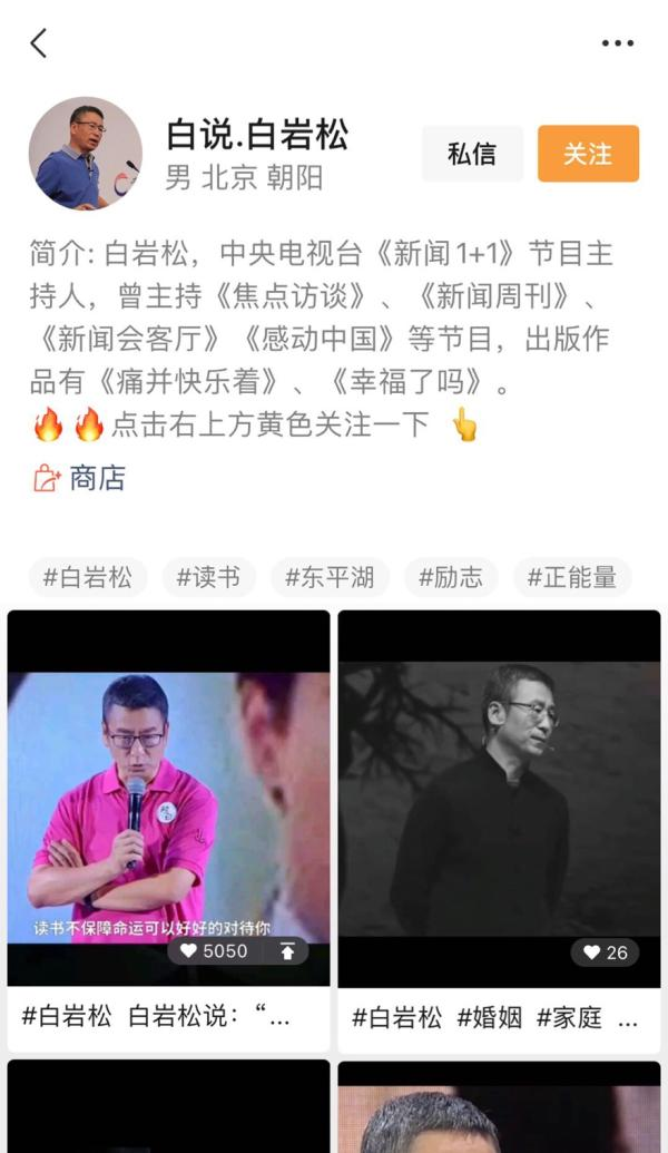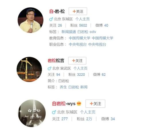 据上观新闻2021年4月报道,在新浪微博上,有各种各样名为"xx白岩松"的账号,甚至还有一个名为"白-岩-松"的账号,头像是白岩松本人,地址为北京市东城区,标签是新闻频道、白岩松、cctv,教育信息为中国传媒大学,职业信息为中央电视台。但这根本不是白岩松本人开的,而是白岩松的高仿号。看到这样详细的简介,不知情的网友真有可能以为是白岩松本人的账号。在微信公众平台和微信视频号上,以"白岩松"命名的账号更是不胜枚举。