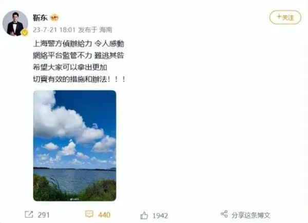 另据法治网消息,据多家媒体报道,今年5月至7月,上海静安警方赴多省市开展"假靳东"诈骗团伙收网行动,先后抓获8名犯罪嫌疑人。多位60多岁阿姨应援"假靳东"被骗。有网友表示:"怎么又是他?"
