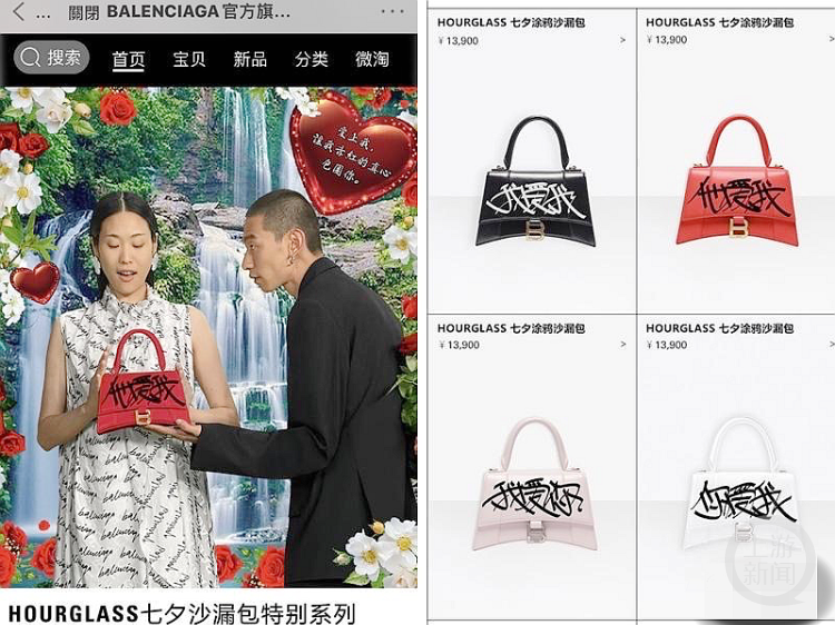 当年8月,法国奢侈品牌巴黎世家在品牌天猫旗舰店发布了红、黑、粉、白四种颜色的限量版2020七夕“沙漏包”特别系列,产品分别印有“我爱你”“你爱我”“我爱我”“他爱我”,字体则是特殊设计的中文艺术字体。