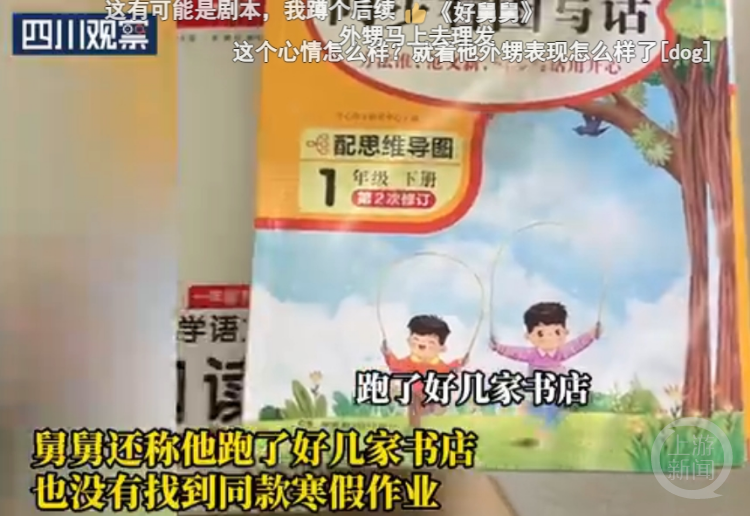 “秦朗舅舅”还表示,目前姐姐还不知道这件事。他迅速趁热打铁,不仅发视频表示,自己到书店为外甥购买了新的寒假作业送过去,还顺势开了一场直播,短时间点赞量达到数万。相关视频显示,“秦朗舅舅”特意跑了好几家书店,但没有找到与丢失作业完全相同的款式。于是,他随意购买了几本其他作业,并额外购买了几套试卷,准备送给“外甥”作为补偿。