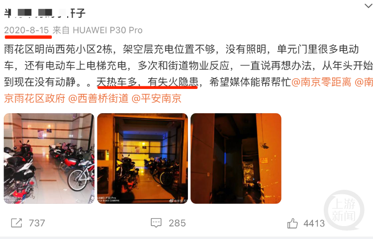 记者从上述网友在2020年8月15日发帖反映的截图看到,里面有“雨花区明尚西苑小区2栋,架空层充电位置不够,没有照明,单元门里很多电动车,还有电动车上电梯充电,多次和街道物业反映,一直说再想办法,从年头开始到现在没有动静。天热车多,有失火隐患,希望媒体能帮帮忙”的内容。2020年8月22日,南京地方媒体以“电动车侵占居民楼门厅隐患大,物业‘望车兴叹’如何破?”为题进行了报道,报道称,媒体实地探访后了解到,该市民反映的问题确实存在,物业也很“头疼”。