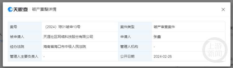 天眼查App显示,该新增破产审查案件申请人为张鑫,经办法院为海南省海口市中级人民法院。天涯社区网络科技股份有限公司成立于1999年4月,法定代表人、董事长兼总经理为邢明,注册资本9300万人民币,由邢明、海南达维互联网投资管理有限公司、达孜研悦管理咨询有限公司等共同持股。