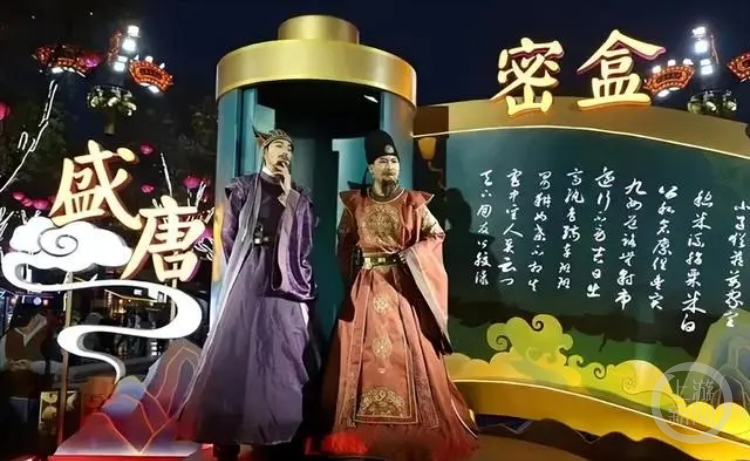“盛唐密盒”是大唐不夜城诸多的演出之一,演出的故事背景出自“房谋杜断”的历史典故。如今,房玄龄与杜如晦这两位唐代名相,乘坐时光机来到大唐不夜城,通过问答的方式为皇帝招贤纳士。互动问答的规则是,答对三道题就可以获得“唐朝至宝”,这些至宝包括电池、棉签、暖宝宝等物品。