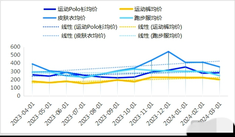 据魔镜数据显示,过去一年,天猫平台上运动Polo衫、运动裤、皮肤衣、跑步服等4类运动服饰的价格均出现了不同程度上涨。