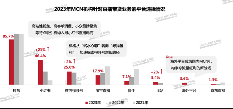 据南方都市报援引数据监测机构克劳锐的报告显示,2023年MCN机构直播带货业务选择的平台中,抖音、小红书、微信视频号和淘宝直播位列前四,尤其是小红书和视频号发展势头迅猛。仅有1.3%的MCN机构选择京东直播,和头部平台相去甚远。以纵向时间维度比较,京东直播对MCN机构的吸引力更是日趋暗淡,2021年有4.2%的份额,2022年降至3%,2023年继续下滑到1.3%。