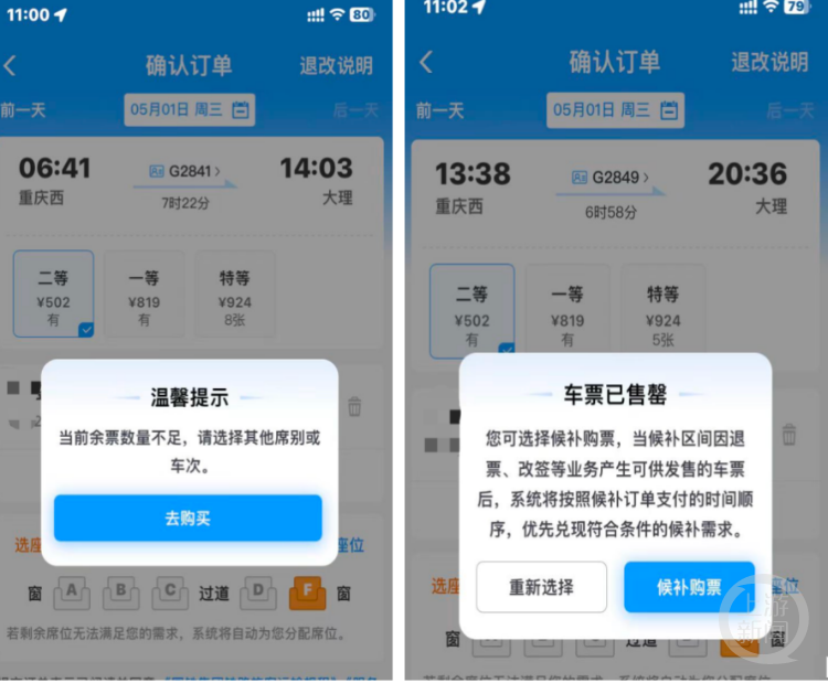 4月17日,记者体验在铁路12306APP上购买5月1日重庆西到旅游目的地大理的火车票。11点00分记者先选择二等席位,系统弹窗“当前余票数量不足,请选择其他席别或车次”,随后切换抢购一等席位,系统弹窗“当前余票数量不足,请选择其他席别或车次”,记者赶紧抢购特等席位,11点02分,系统提示“出票失败”,返回主界面再选坐席,系统弹窗“车票已售罄,您可选择候补购票”。记者在铁路12306APP上,又检索全国多个网红旅游城市,紧俏时段火车票均已提示“候补”。