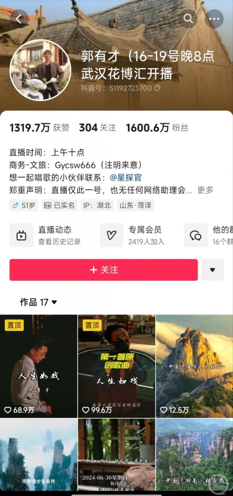 7月18日,郭有才抖音账号粉丝数量为1585万。19日上午直播时,粉丝数量突破1600万,郭有才当众表示感谢,也引发大批网友留言参与讨论。“那些说火不过两个月的,现在打脸了”“不到三个月涨粉到1600万,这个速度还有谁”。还有网友表示遗憾:“要不是在菏泽停播一段时间,可能早就超过2000万了!”