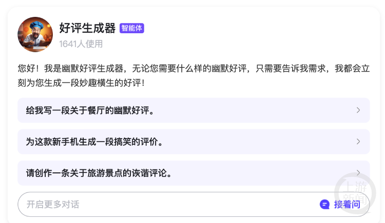 任意打开一个支持智能体的AI助手,搜索“好评”或者“大众点评”,输入关键词句描述,例如:“我昨晚去了一家叫做XX的餐厅,那里的汉堡非常好吃,份量很大,肉质很好,服务员态度非常好,环境也很温馨。请帮我写个好评。”