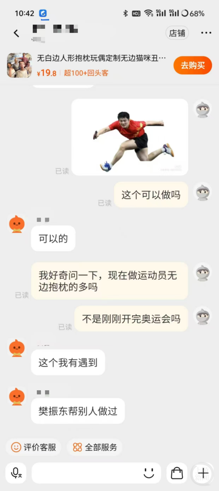 记者随后通过某网购平台,联系了一家“回头客1万+”的无边抱枕商家,该商家可以提供无白边人形抱枕定制服务。记者将小付发布的樊振东截图发给该商家后,客服人员很快确认可以定制成人形抱枕,还透露:“这个我有遇到过,樊振东刚帮别人做过。”