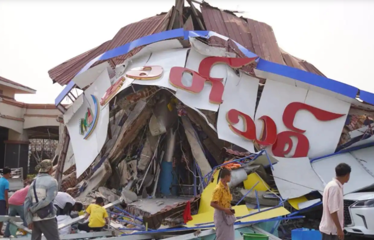 3月28日,缅甸曼德勒,震后人们走过倒塌的建筑物。视觉中国