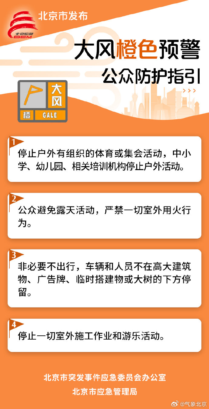 同时,@气象北京 提醒大家如果外出,要远离可能引起狭管效应的区域,比如说两栋高楼之间的狭长通道,这些往往是风力加大比较明显的地方,而且要远离临时搭建物、广告牌,防范高空坠物。
