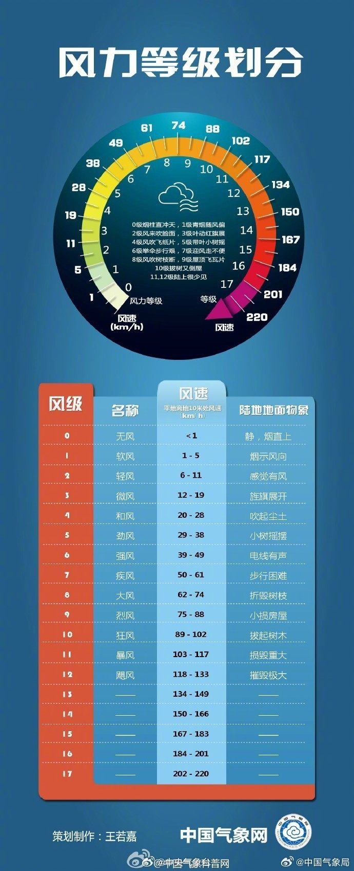 根据我国2012年6月发布的《风力等级》国家标准,依据标准气象观测场10米高度处的风速大小,将风力等级依次划分为18个等级,11、12级风陆上很少见,一般当风力超过12级时,就意味着对陆地地面物象“摧毁极大”。