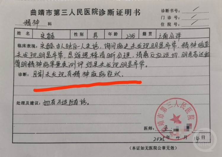2025年4月14日,在当地卫健部门协调下,宋赫再次到曲靖市第三人民医院进行诊断。诊断证明书显示,其临床表现为:精神检查未发现明显异常,思维逻辑清晰合理,情感反应适切,明尼苏达和简明精神病等量表测评结果未发现明显异常。诊断结果为目前未发现有精神疾病症状。