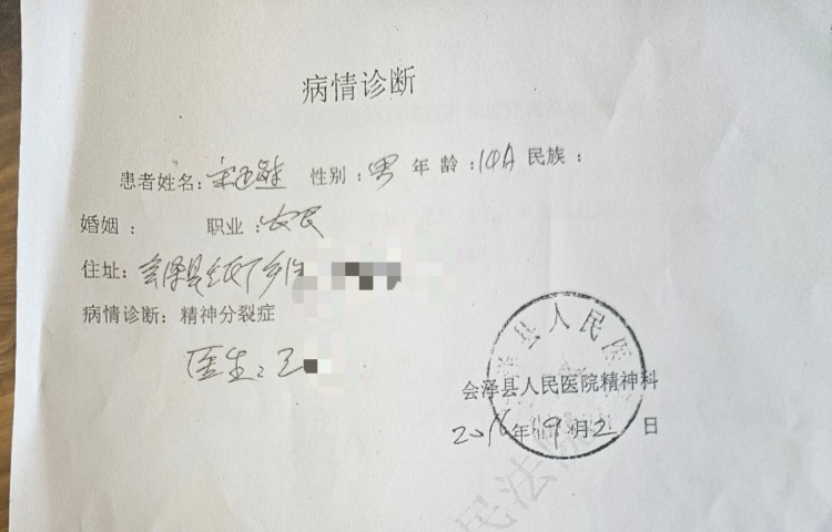 一个多月后,他收到会泽县相关部门的反馈,称在纸厂卫生院找到了他的病历资料。2024年6月13日,宋赫从纸厂乡拿到了相应材料——在8年前的2016年9月,他被会泽县人民医院精神科医生王某诊断为精神分裂症,并纳入重性精神障碍管理网络。