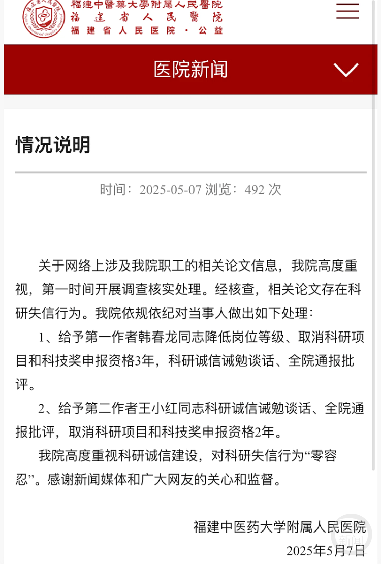 5月8日,福建中医药大学附属人民医院回应舆情,在官网发布通报称,涉事论文确属科研失信行为,已对第一作者韩某某和第二作者王某某作出降级、取消科研资格、通报批评等处理。医院表态称“对科研失信行为‘零容忍’,感谢媒体和网友监督”。