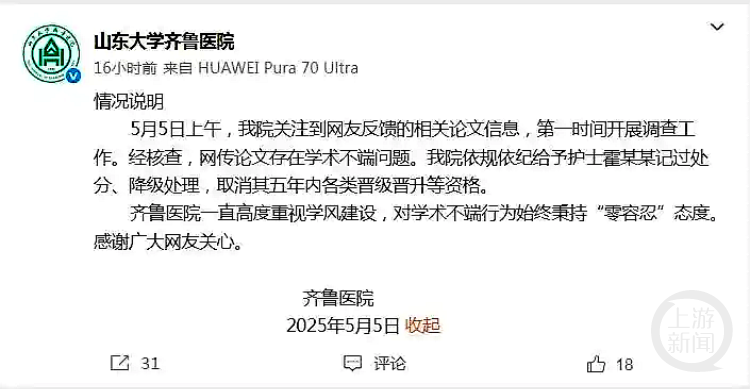山东大学齐鲁医院对涉事论文作者进行处理。 网络图