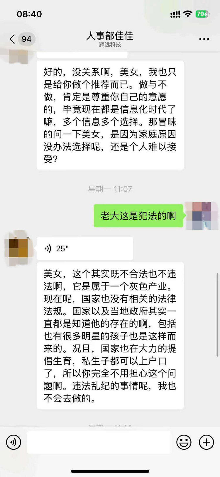 辉远科技“人事部佳佳”劝应聘找工作的女子去做代孕。网络图