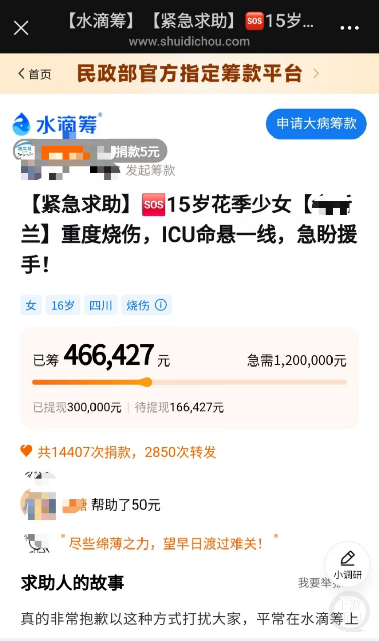 余先生在求助中称,女儿小兰今年15岁,是成都某中学初三学生,6月25日凌晨在发生火灾逃生时被烧伤,医院诊断为“特重烧伤”。