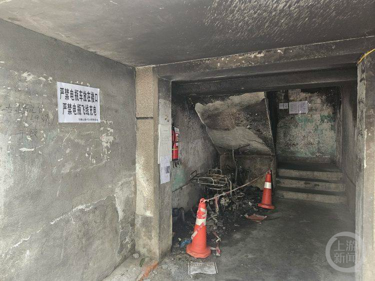 火灾发生地位于成都市金牛区马鞍山路1号院1单元。29日上午,上游新闻记者到访涉事小区,看到在起火楼道口停留着一辆被烧毁的电瓶车,墙壁和台阶被熏得黢黑,墙壁上的电表和电线也被烧毁。记者顺着台阶走到顶楼6楼,发现6楼仍有被浓烟熏黑的迹象。